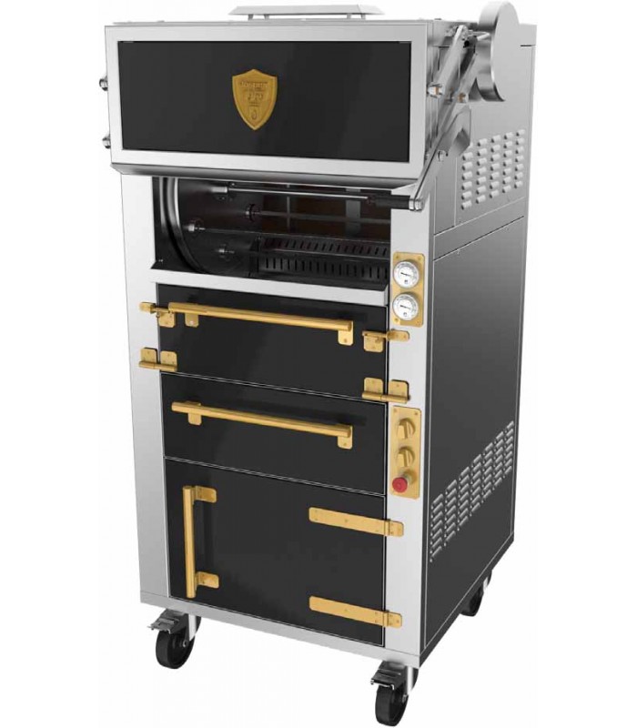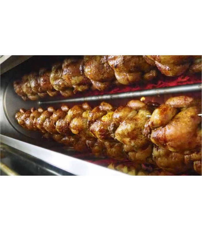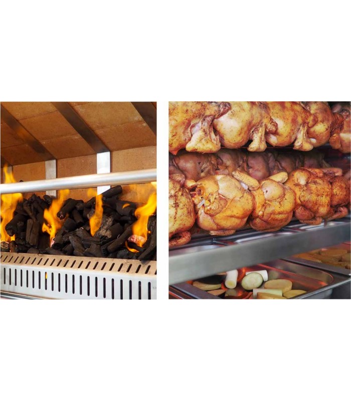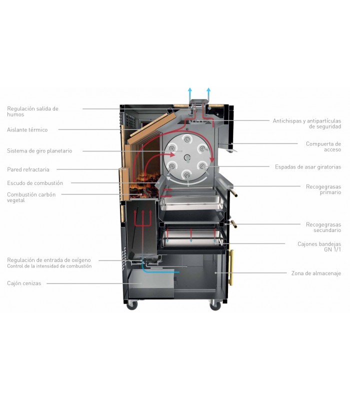 Accesorios incluidos: juego de pinchos, espadas, 2 ganchos para sacar espadas, 8 bandejas G/N 1/1 inox, pinzas, atizador y cajón de cenizas.
