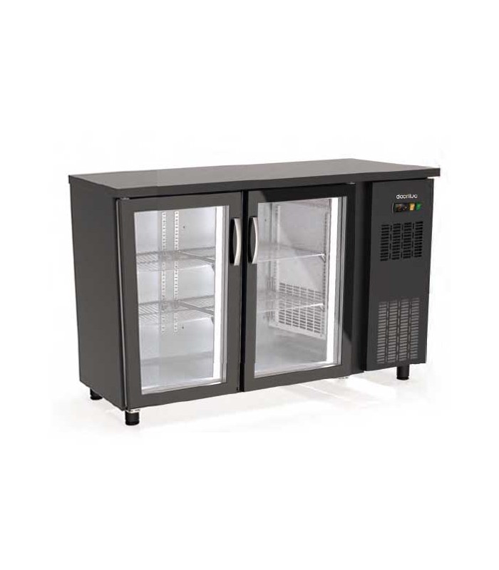 Expositor refrigerado bajo Docriluc DSBE-150 encastrable con puertas abatibles de doble cristal. Ideal para barras de bar, cafeterías, tiendas y estaciones de servicio que necesitan refrigeración eficiente integrada en el mobiliario.