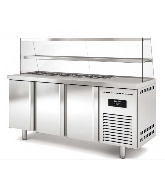 Mesa refrigerada snack Docriluc MDK70-180 | GN con estante superior. 399 L de capacidad, 3 estantes, alta potencia y estructura snack para doble funcionalidad.