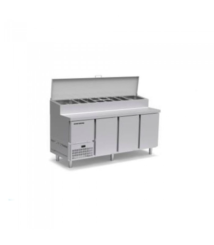 La TG-1400 de Oscar Zarzosa es una mesa refrigerada profesional especializada en preparación de ensaladas y mise en place en frío. Está equipada con espacio para cubetas GN en la parte superior, que permite mantener ingredientes frescos siempre accesibles durante el servicio.