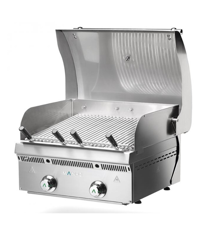 Barbacoa de gas MAINHO PBV-60+THP-60 con tapa y con dos fuegos. Construcción robusta en acero inoxidable, con parrilla cóncava que acelera la cocción un 60% y termómetro integrado para un control preciso. Ideal para hostelería profesional, asegura resultados homogéneos y un mantenimiento sencillo, optimizando tiempo y calidad en cada uso.