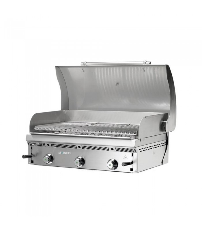 Barbacoa de gas MAINHO PBV-90+THP-90 con tapa y con tres fuegos. Construcción robusta en acero inoxidable, con parrilla cóncava que acelera la cocción un 60% y termómetro integrado para un control preciso. Ideal para hostelería profesional, asegura resultados homogéneos y un mantenimiento sencillo, optimizando tiempo y calidad en cada uso.