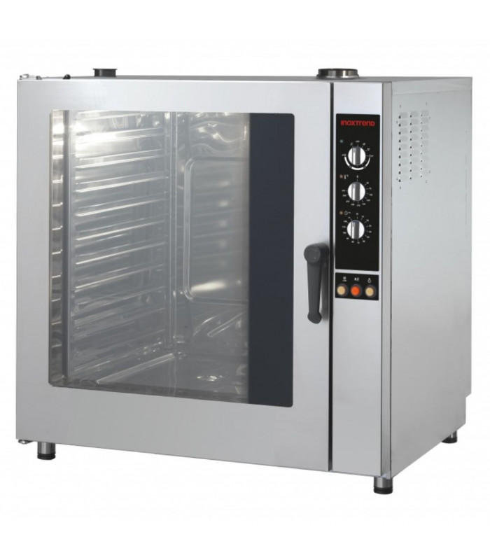 Horno mixto analógico a gas Inoxtrend CDA–211 G, con capacidad para 11 bandejas GN 2/1, para todo tipo de cocinas incluidas las más pequeñas que puede trabajar con cocción a vapor y convección (Vapor directo / Convección /Convección-vapor).