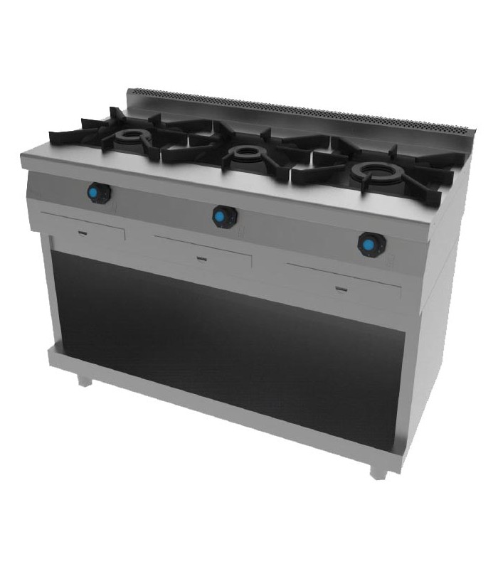 Consigue la cocina industrial a gas JEMI T631. Es una linea de cocina de fondo 600mm con soporte y tres quemadores, ideal para restaurantes, bares y chiringuitos que requieran de una gama muy eficiente con sobre y frontal realizados en inox. Una cocina potente, robusta y versátil.