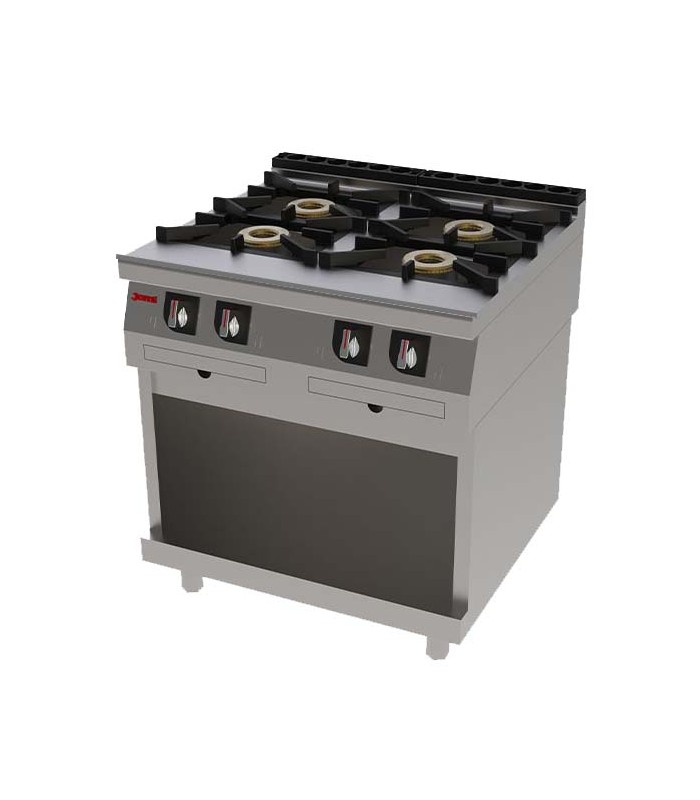 Consigue la cocina industrial a gas JEMI T741, la cocina por excelencia: muy potente, robusta y versátil con soporte, cuatro fuegos y un fondo de 750, ideal para restaurantes, bares, etc que requieran de la gama muy eficiente con sobre y frontal realizados en inox de 1,5mm de espesor.