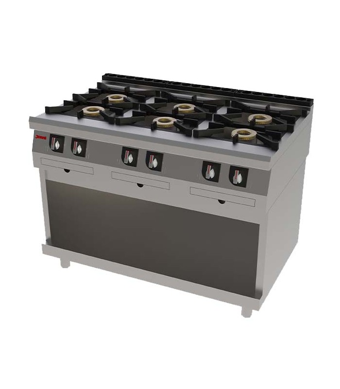 Este modelo está fabricado completamente en acero inoxidable, lo que facilita la limpieza y garantiza resistencia ante el calor, humedad y grasa. Los 6 fuegos están perfectamente distribuidos para permitir el uso simultáneo de recipientes grandes. La base cerrada aporta solidez y puede utilizarse como zona de almacenaje inferior o soporte estructural.