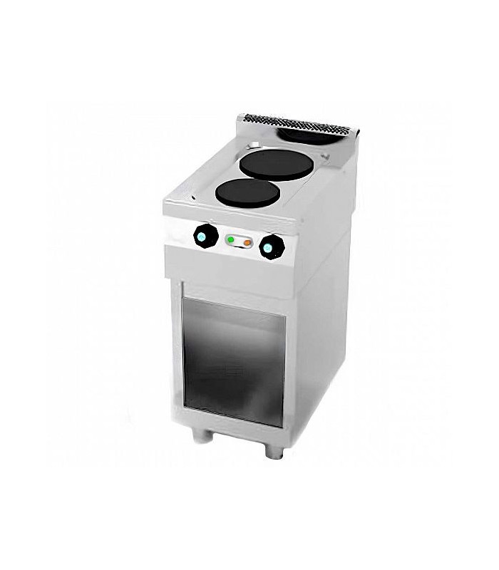 La cocina eléctrica Jemi T602E es un modelo de instalación en suelo con estructura propia que pertenece a la prestigiosa serie 600 EV. Está diseñada para ofrecer máxima funcionalidad en espacios reducidos, permitiendo una cocción eficiente y segura gracias a sus dos placas de diferente diámetro. Con una potencia total de 4,6 kW y alimentación trifásica, es ideal para cocinas profesionales con requerimientos específicos de espacio y rendimiento.