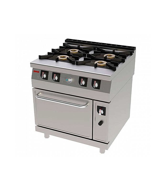 Cocina a gas 741 CHEF de JEMI. 6 fuegos de alto rendimiento y horno gas de 4,6 kW integrados en una estructura sólida.