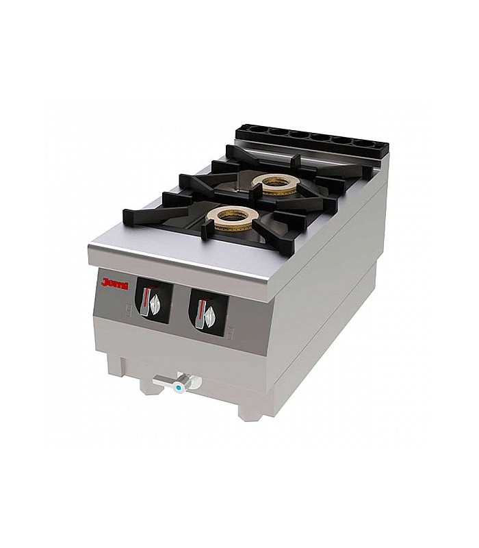 Cocina a gas S721 CHEF de JEMI. Diseño compacto, 2 quemadores potentes de 7,4 kW y sistema de agua CHEF que facilita la limpieza intensiva.