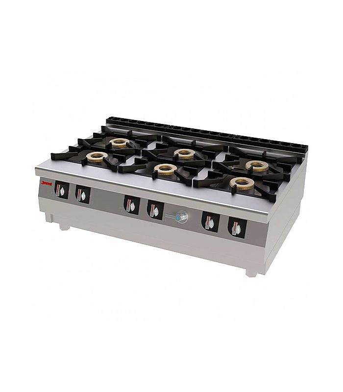 Cocina a gas S761 CHEF de JEMI. 6 fuegos de 7,4 kW y sistema agua CHEF sobre superficie baja, ideal para líneas modulares de cocción.