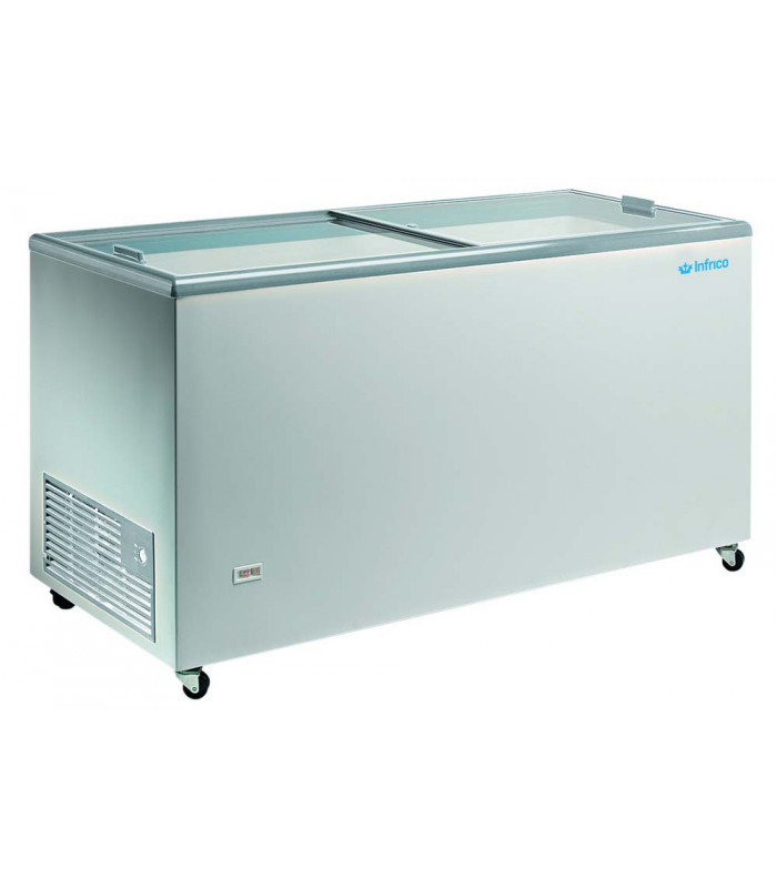Congelador arcón con puerta corredera de cristal Infrico HF 400 TCG con 327 L de capacidad. Los congeladores de arcón son un tipo de maquinaria ideal para negocios de hostelería ya que permiten almacenar grandes cantidades de alimentos con toda seguridad, su función es la de almacenar alimentos a una temperatura de a partir de -18ºC y así evitar la actividad bacteorológica.