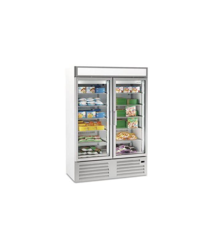 La expositora de congelación INFRICO NEC1002FV, es una expositora de 2 puertas con 1000 L de capacidad y una temperatura de -15ºC/-25ºC. Con acabado de acero plastificado y puertas de cristal.
