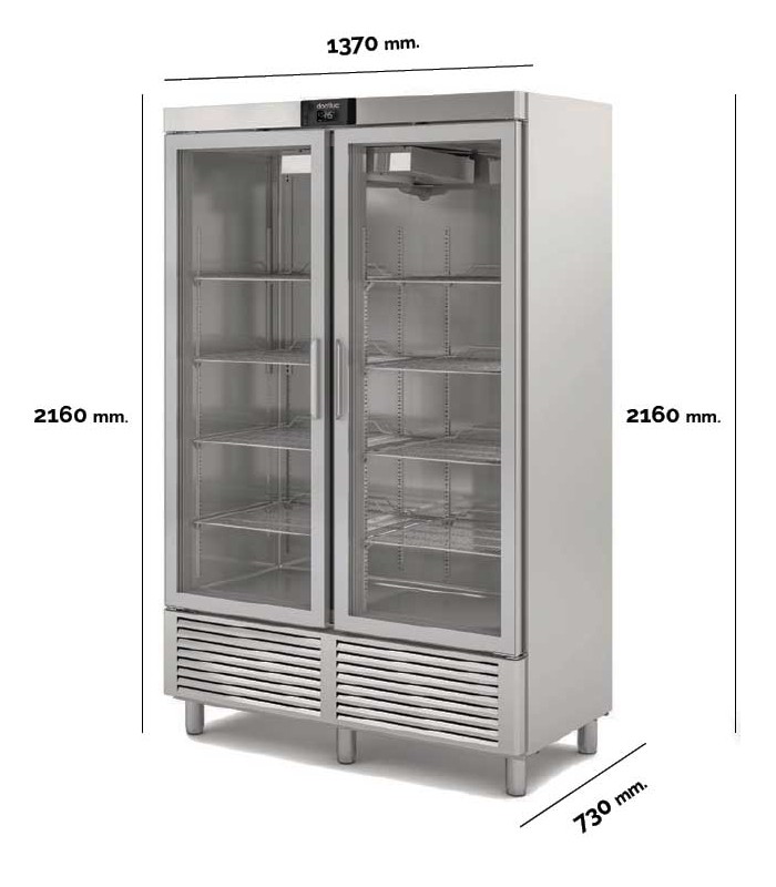 Su diseño de doble puerta vertical (superior e inferior), los 8 estantes de acero plastificado, y un control electrónico preciso lo convierten en una opción ideal para supermercados, cocinas industriales, obradores y tiendas de alimentación con alto tránsito.