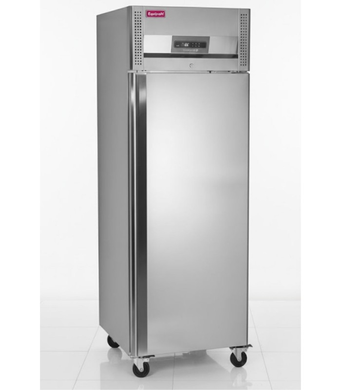 Congelador vertical TEFCOLD RF505 en acero inoxidable con puerta reversible y cierre automático.