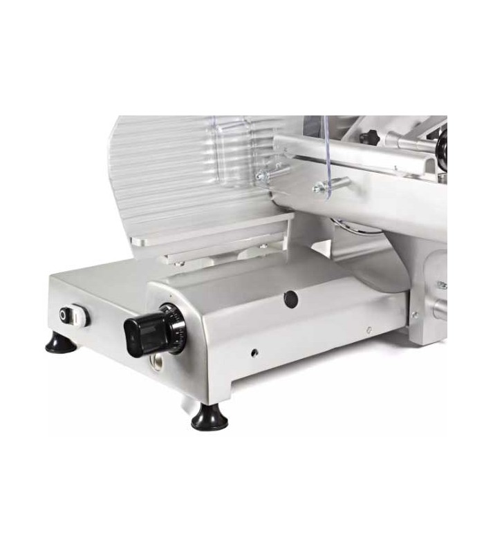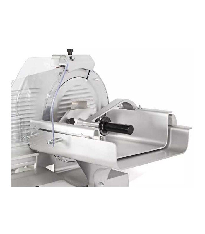 Esta máquina está diseñada para quienes manejan grandes formatos de carne o embutido y buscan una cortadora más robusta, más estable y con mayor capacidad de corte. Su carro deslizante permite cortes precisos sin esfuerzo y en menos tiempo.