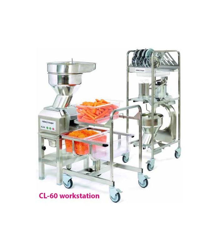 Corta-hortalizas Robot Coupe CL 60 Workstation trifásico con carro inox y pack multicorte. Recomendado por EquipoH por su capacidad integral de corte vegetal y eficiencia total.