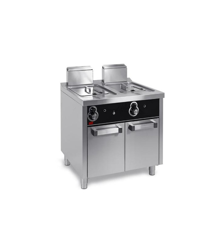 La FDG12L12L750E es una freidora a gas con doble cuba y mueble soporte, diseñada para entornos de alto rendimiento donde se necesita gran capacidad de fritura y máxima eficiencia. Sus 24 litros totales, distribuidos en dos cubas independientes de 12 litros, permiten trabajar productos diferentes sin contaminaciones cruzadas y con total control del servicio.