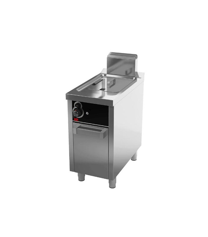 El mueble integrado no solo aporta estabilidad y altura de trabajo ergonómica, sino también espacio útil y orden en la cocina. Su grifo de vaciado reduce los tiempos de limpieza y evita riesgos. Con 8,5 kW de potencia, ofrece una respuesta térmica rápida incluso durante los picos de producción.