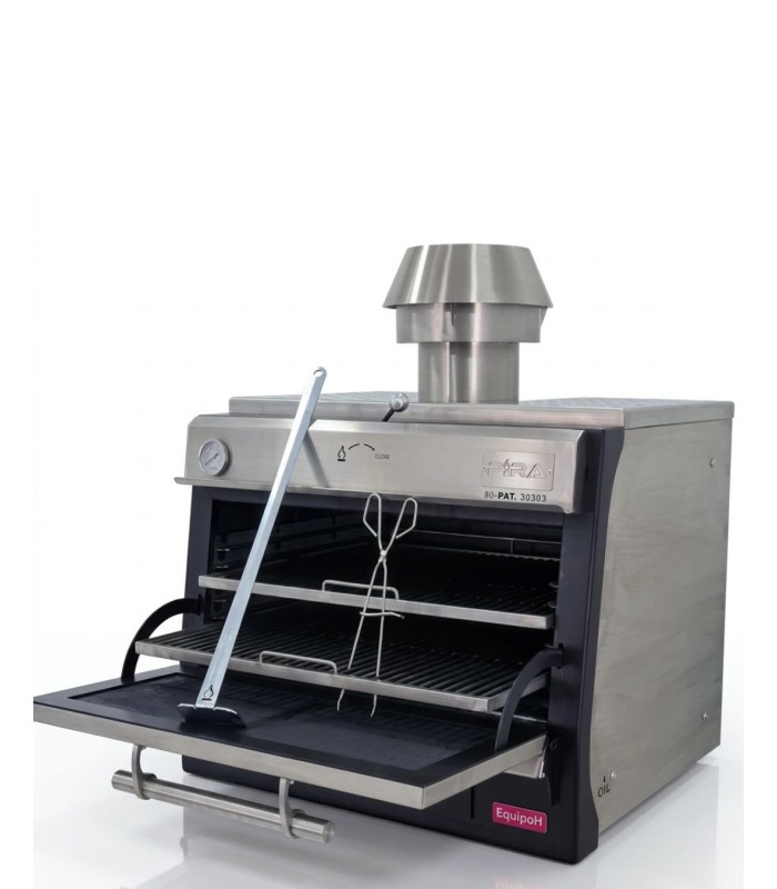 Horno brasa Pira 80 Lux SD con cristal panorámico y sistema Piracold. Un horno brasa profesional de carbón vegetal diseñado para alto rendimiento en cocina profesional, capaz de producir hasta 75 kg/h.