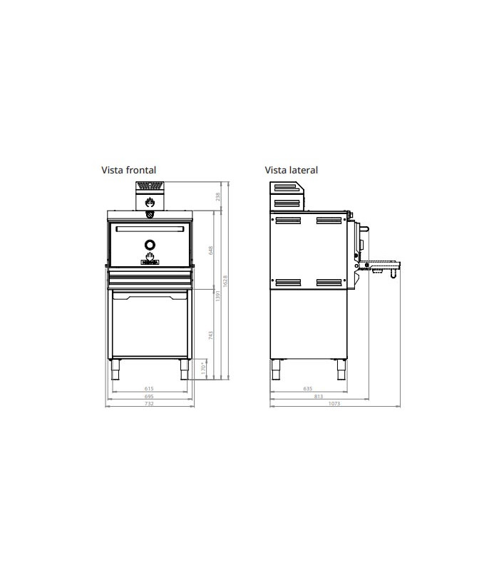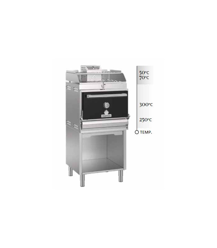 Horno de carbón con mueble y soporte bandejas Mibrasa HMB MA SB 75, destaca por su robustez, facilidad de uso y su cero mantenimiento. Los modelos Base son perfectos para cocinas con un espacio que requiera un soporte de trabajo para el horno Mibrasa