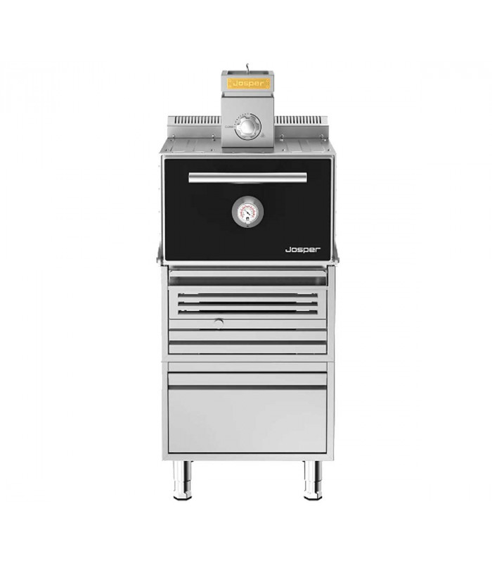El horno de carbón Josper Josper HJX-PRO-S80-TD con mesa y cajón es una elegante combinación entre una parrilla y un horno en una sola máquina. Trabaja 100% con carbón vegetal, tiene un diseño único de barbacoa cerrada, con diferentes niveles de braseado, un sistema de puerta frontal, ágil y robusta, de fácil manejo y control de temperatura por un sistema de tiros. Aportando el valor añadido que desprende la leña (carbón) a la materia prima, conseguiremos esos sabores de antaño, además de una textura y jugosidad perfectas. Combinando la función parrilla + horno, trabajamos con altas temperaturas, sellando el producto, ahumando y braseando a la vez. Resultados únicos, convirtiendo así al Horno Brasa Josper en una máquina única también.