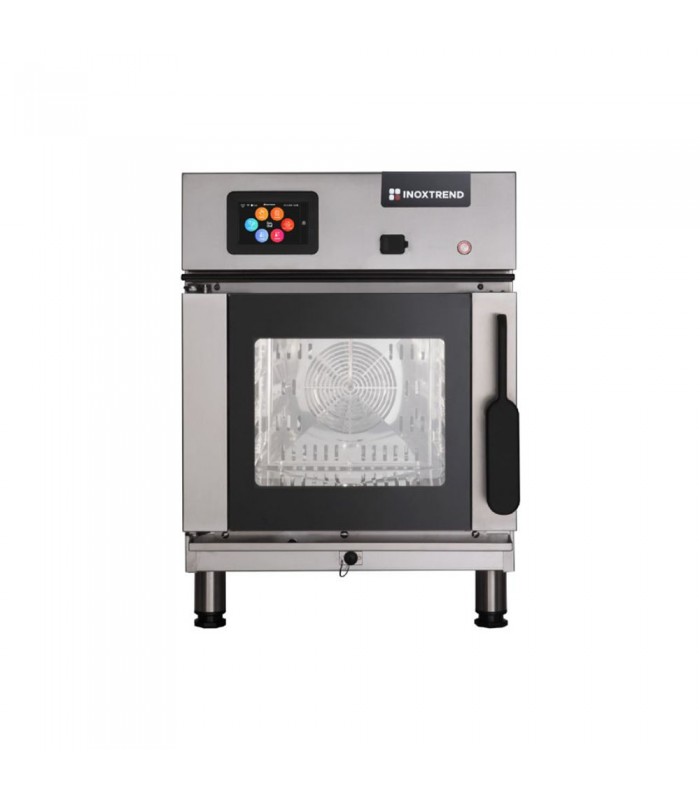 Horno eléctrico mixto industrial Inoxtrend CTDT-104E con capacidad para 4 bandejas GN 1/1. Una opción muy completa que gracias a su reducido tamaño será ideal para cualquier tipo de cocina. Cuenta con un panel digital táctil programable. Modalidad de cocción manual o con programas automáticos.