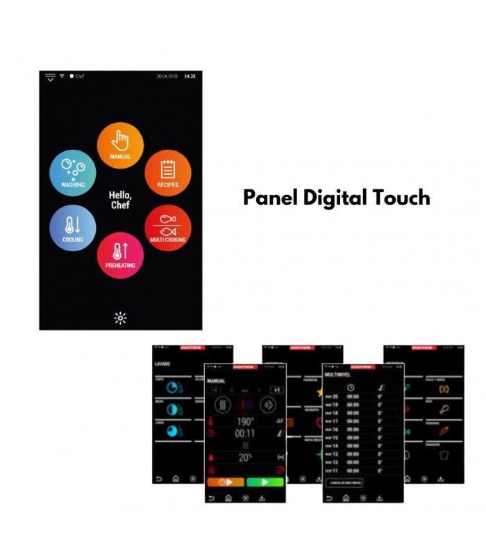 Pantalla Táctil Touch Screen. Con modalidad de cocción manual o con programas automáticos (con 150 programas almacenados y disponibilidad de otros 150). Y conexión USB para almacenamiento de datos HACCP.