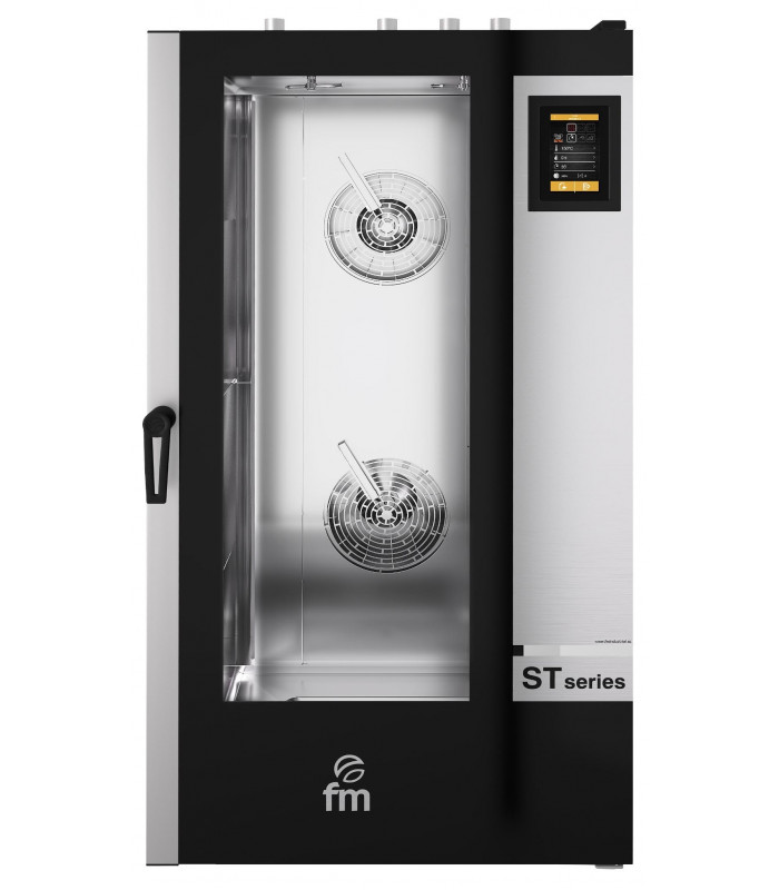 Horno industrial a gas para panaderia FM STB 18/86 V7 T GAS de convección perfecto para panaderias, un modelo con capacidad para 18 bandejas 800x600 | (36) 600x400.Presenta un panel digital muy intuitivo con pantalla táctil de 7 pulgadas a color con recetario de fotografias personalizables y sus 99 programas con 3 modos de cocción.