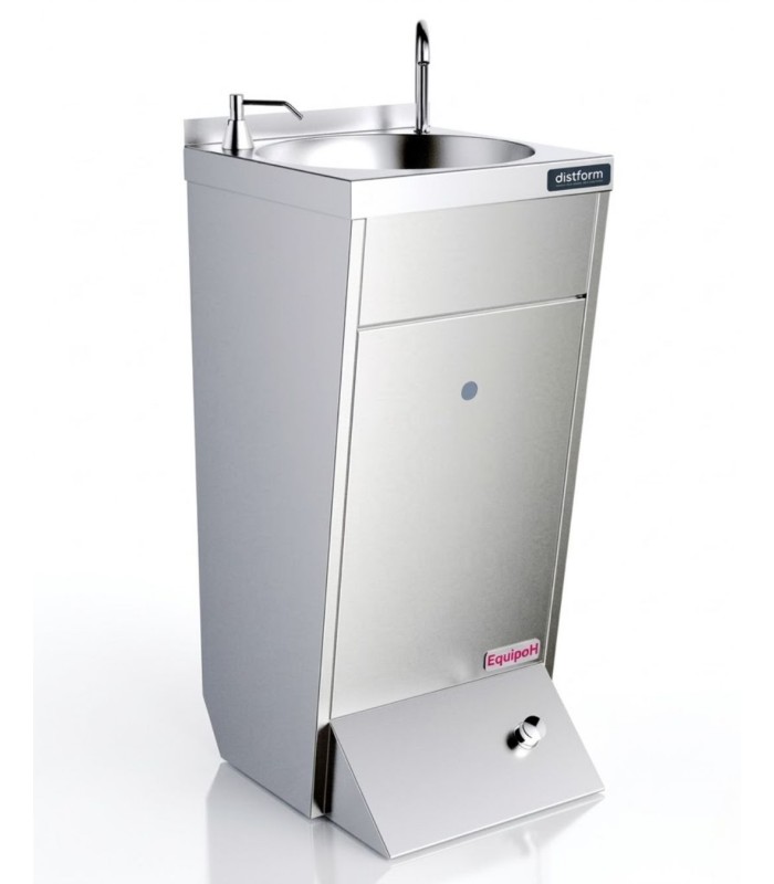 Lavamanos de pie Distform con caño giratorio y pulsador. Diseñado para espacios donde no hay encimeras o montaje mural. Ideal para cocinas, colectividades y zonas móviles.