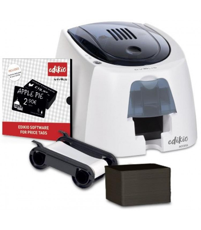 La Edikio Access Price Tag es la solución completa para etiquetas de precio personalizadas en PVC. Incluye impresora Edikio Access (USB, impresión a una cara), software Edikio Lite, 100 tarjetas negras CR-80 en PVC mate y una cinta monocromática blanca para 500 impresiones.