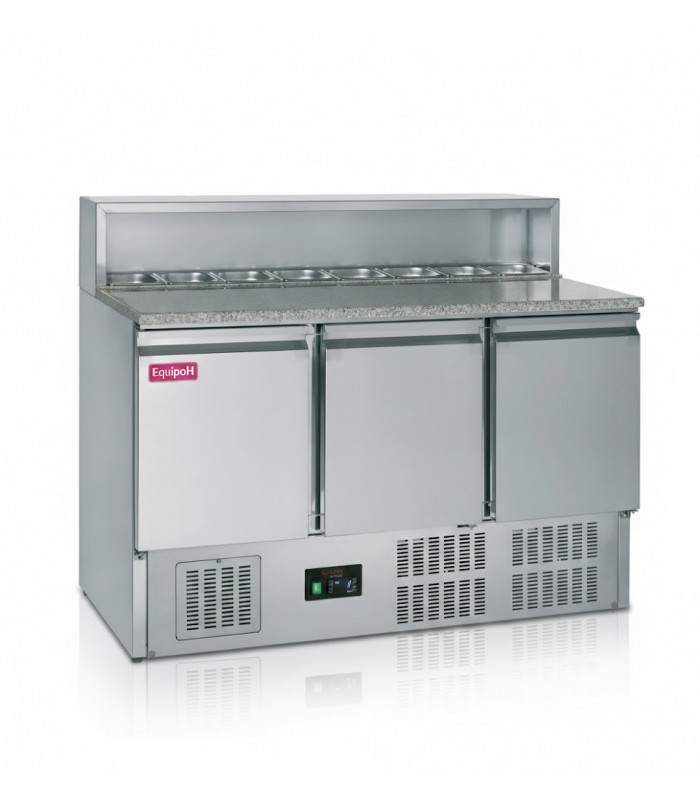 Su encimera de granito profesional mantiene una temperatura fría constante, facilitando el estirado de la masa y evitando que se adhiera. El armario inferior con 3 puertas GN1/1 permite almacenar ingredientes organizados y accesibles durante todo el servicio.