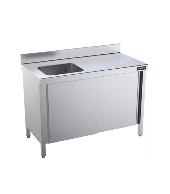 Cuando se necesita una solución de trabajo compacta que combine zona de lavado, espacio de trabajo y almacenaje cerrado, esta mesa mural con cubeta y puertas de Distform es la opción ideal.