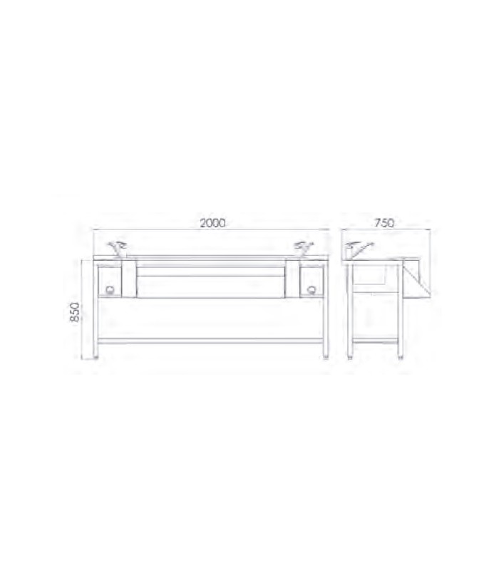 Con 2000 mm de largo y una estructura reforzada, incorpora dos fregaderos, cuba central de gran capacidad, tabla de corte triple, zona para botellas, zona de ingredientes y tolvas para residuos. Todo en acero inoxidable AISI 304 18/10, con frontal redondeado y marco inferior reforzado para máxima estabilidad.