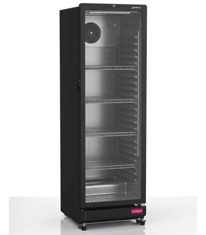 Armario expositor refrigerado Edenox APE-451-C S2 BLACK cooler bebidas 338L. Refrigerador vertical profesional con puerta de cristal doble, iluminación LED superior y lateral y temperatura de +1 °C a +10 °C. En EquipoH lo recomendamos por su diseño negro elegante y gran visibilidad del producto.