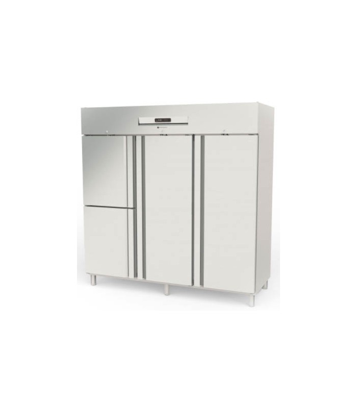 Diseñado con tres puertas y estructura interior reforzada, este modelo incluye guías embutidas para un uso intensivo con cubetas GN 2/1. Su iluminación LED, cerradura de serie y panel de control elevable mejoran la experiencia del operario. Además, su aislamiento de 75 mm y sistema de desescarche automático garantizan ahorro energético y durabilidad.