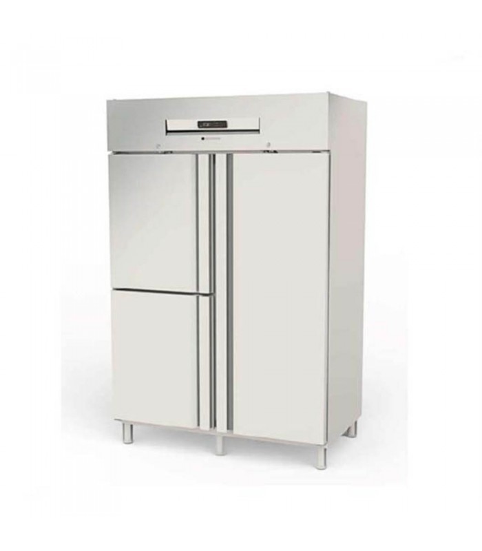 El formato mixto mejora la ergonomía de trabajo en cocinas dinámicas. Los estantes embutidos con 24 niveles ajustables permiten adaptar el espacio a las necesidades del momento. Y gracias a su sistema de cierre automático, luz LED, control digital y aislamiento de 75 mm, ofrece seguridad, eficiencia y sostenibilidad.