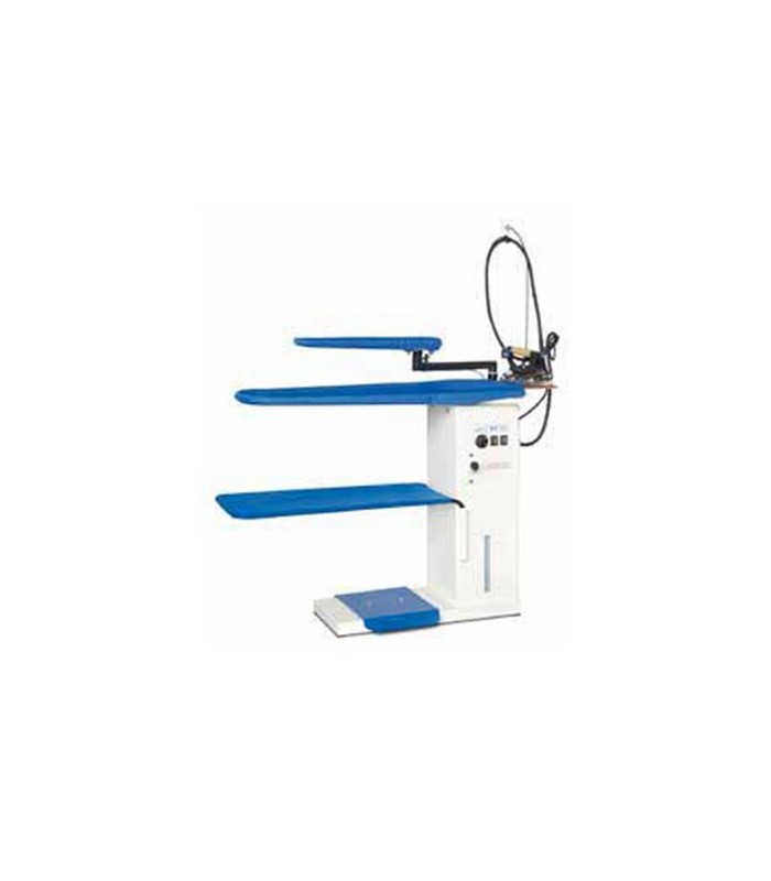 Mesa de repaso FDA de Primer, Mesa aspirante con caldera, con plato universal y calentada eléctricamente.Versión con caldera eléctrica incorporada, bomba de alimentación de agua, depósito de agua y plancha de vapor. Aspirador monofásico incorporado accionado mediante pedal. Temperatura del plato regulable por termostato. Pedales a ambos lados de la máquina.