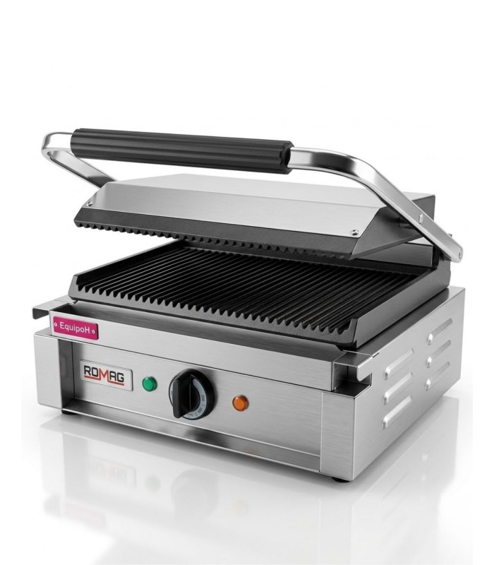 Sandwichera profesional Panini Medio de Romagsa. Placa superior basculante, 2200 W y termostato regulable hasta 300 ºC.
