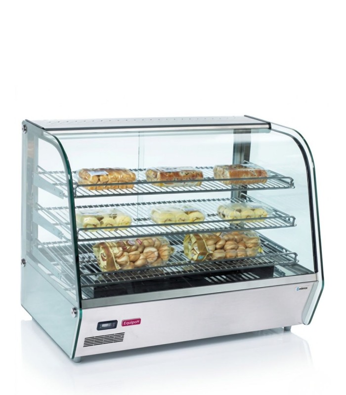 Vitrina expositora caliente Edenox VECS-100 de sobremesa compacta. Vitrina profesional con 85 litros de capacidad y 800 W de potencia, diseñada para mantener alimentos calientes mientras se exponen al cliente con máxima visibilidad.