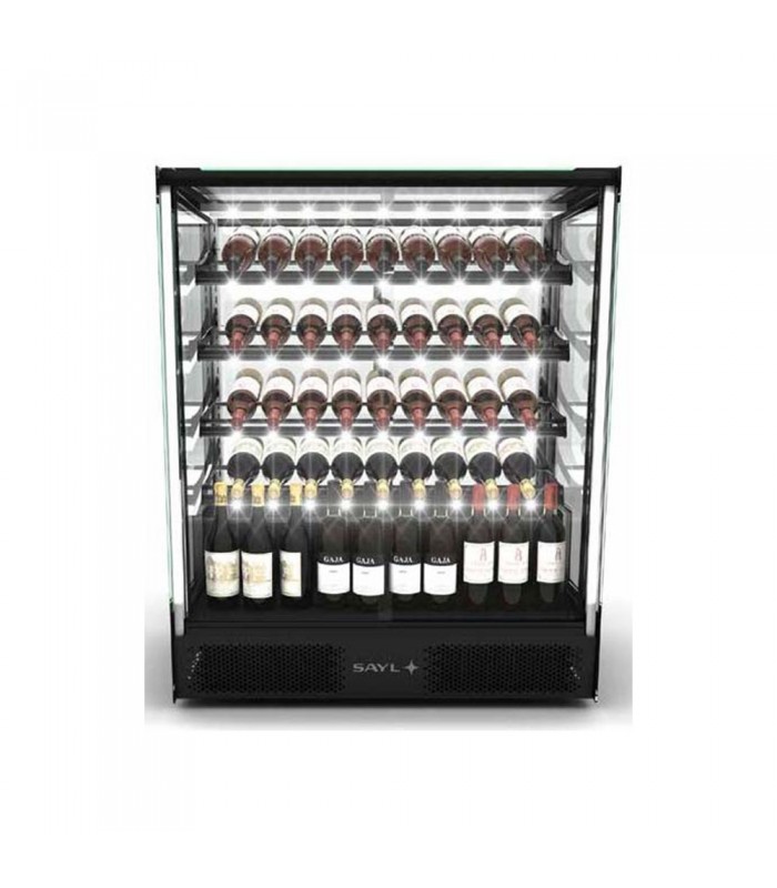 Vitrina expositora refrigerada de Sayl modelo PAK-RAA-W de la serie PAK WINE diseñadas para mantener el contacto del vino con el corcho de la botella, con capacidad para 9 botellas por estante, perfecta visualización e iluminación de las botellas, gran accesibilidad, estantes con iluminación incorporada, máximo aprovechamiento del espacio de exposición, cristales con cristal cámara y puertas de cristal con sistema autocierre.